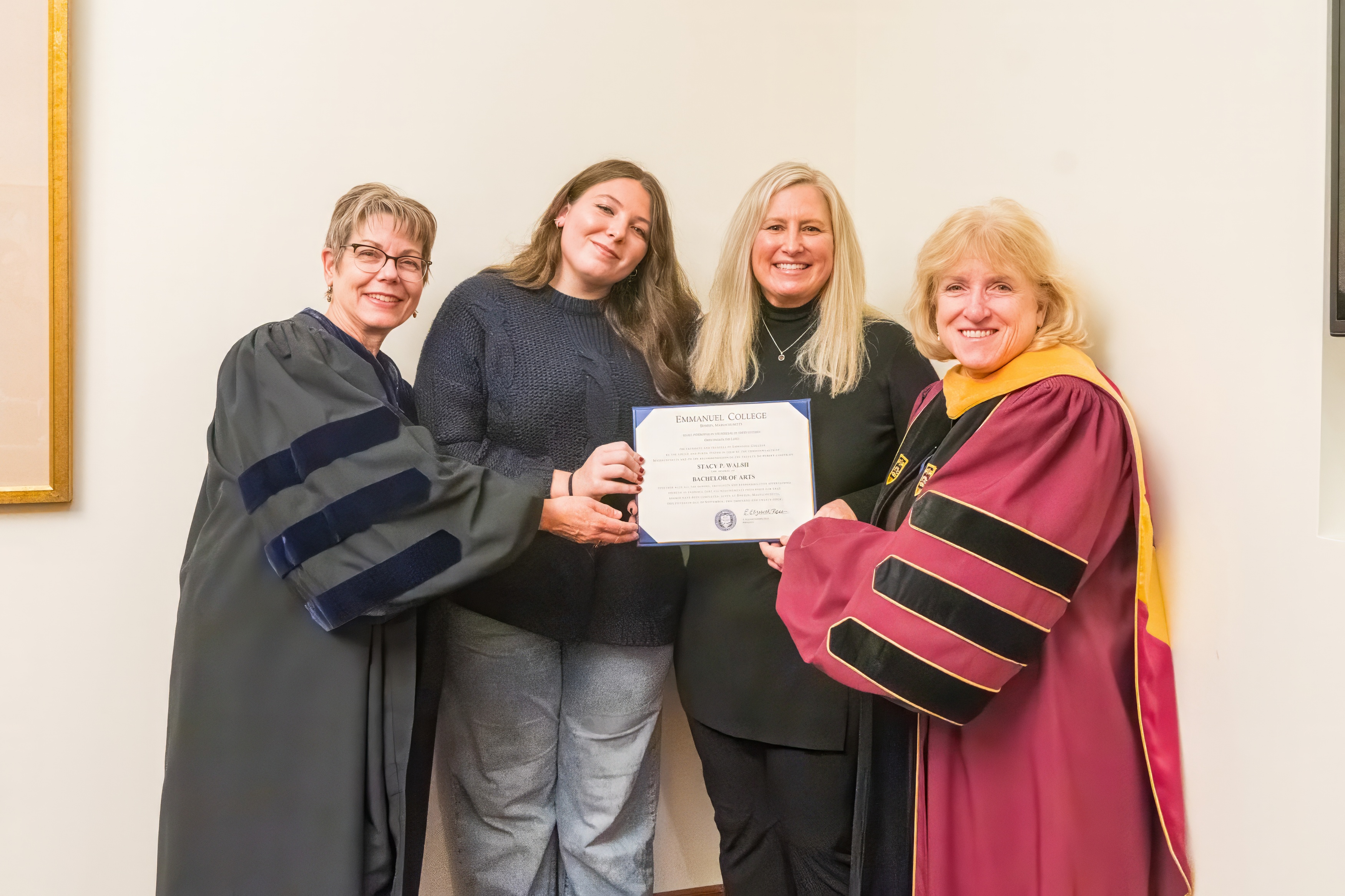 Emmanuel Interim Chief Academic Officer Diane Shea (left) presents the Bachelor of Arts that Stacy Walsh ’24 completed over the summer. Walsh resolved to finish her degree after dropping off her stepdaughter Lexi (right) last fall. Going into her senior year at Emmanuel College, Stacy Walsh ’24 wasn’t planning a final project focused on Artificial Intelligence (AI). She had...