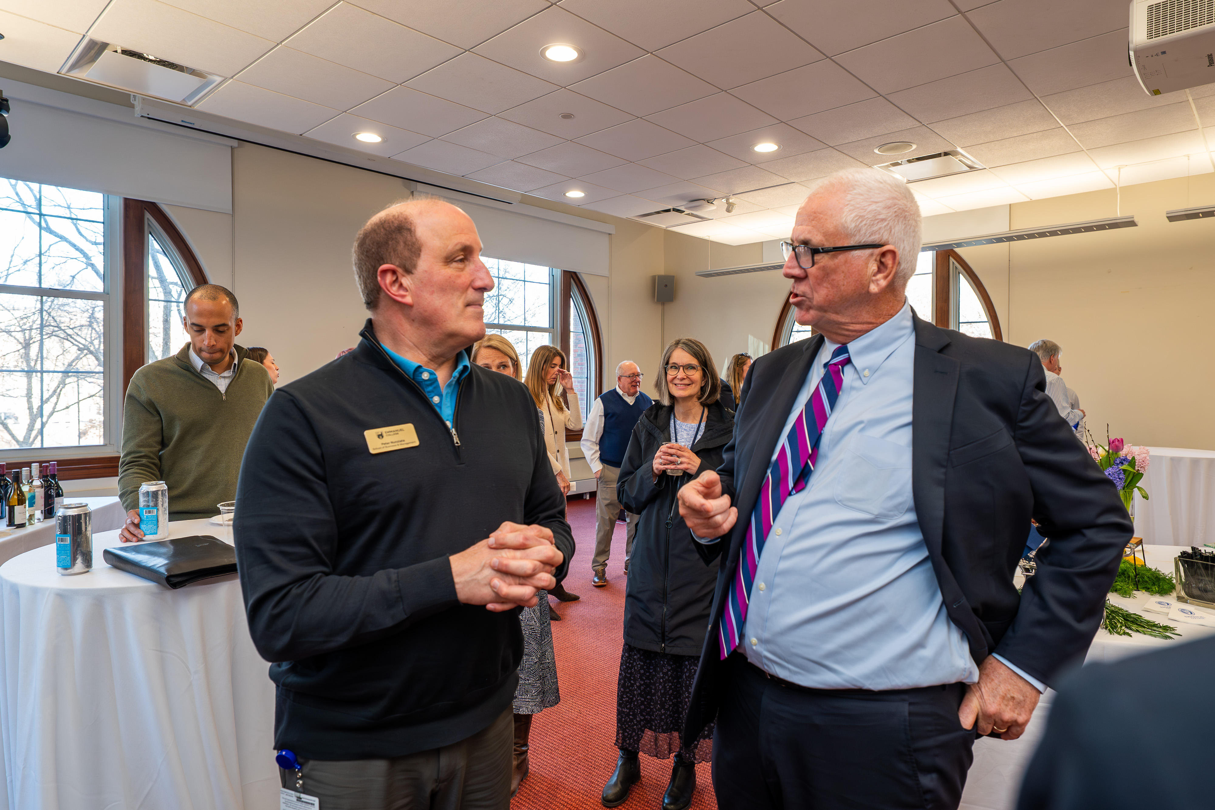 Nunziata (left) chats with Joseph R. Nolan Jr., President and Chief Executive Officer at Eversource, at the College's recent Emmanuel Business Collaborative (EBC) Speaker Series.