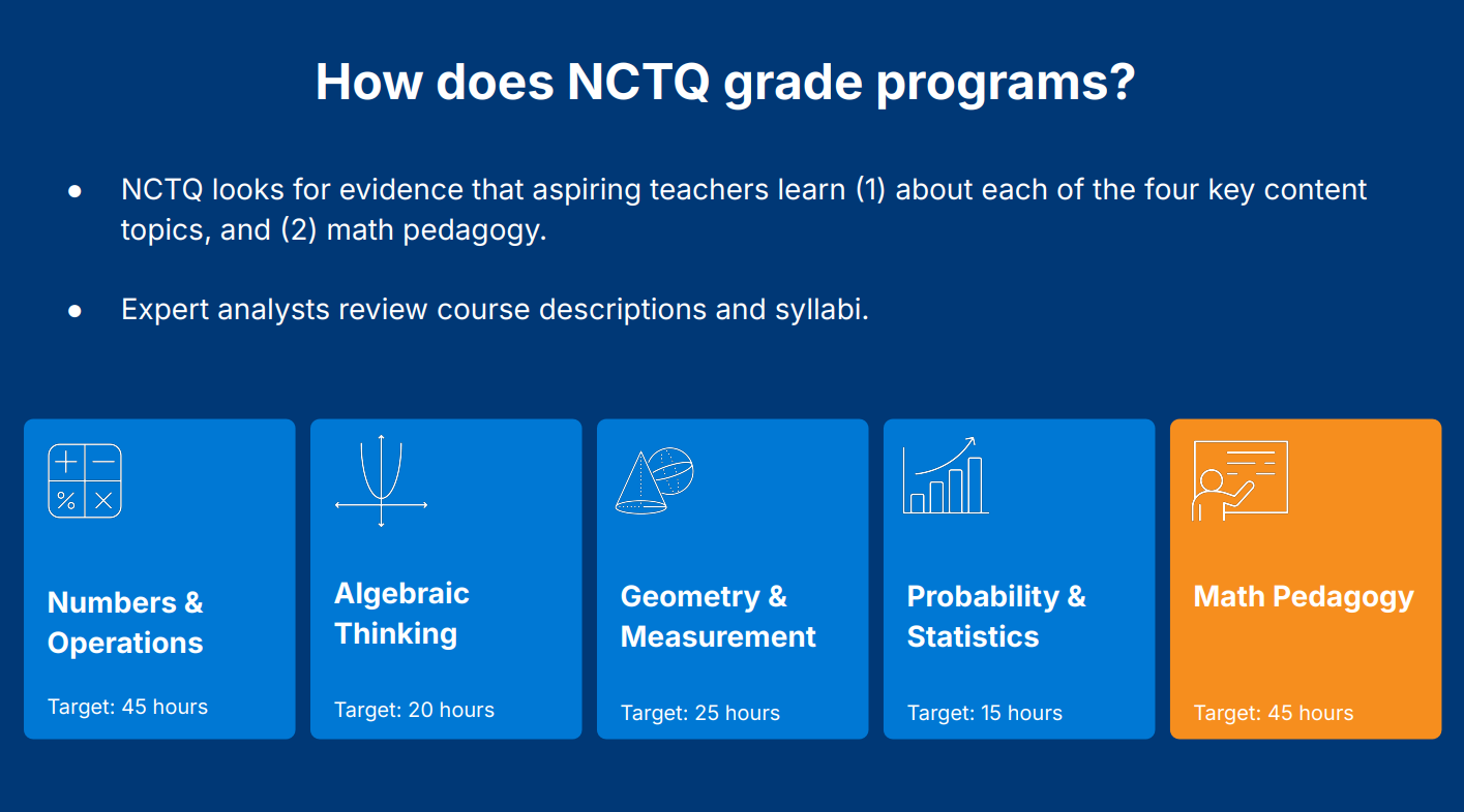 “Teachers need to know how to do more than just follow the steps in math to get the right answer. They need to know why those steps work,” said NCTQ President Heather Peske. “It’s like the difference between a basketball player and a coach. The player can learn their role and follow directions, but the coach needs to understand the bigger picture—the why behind every move.”