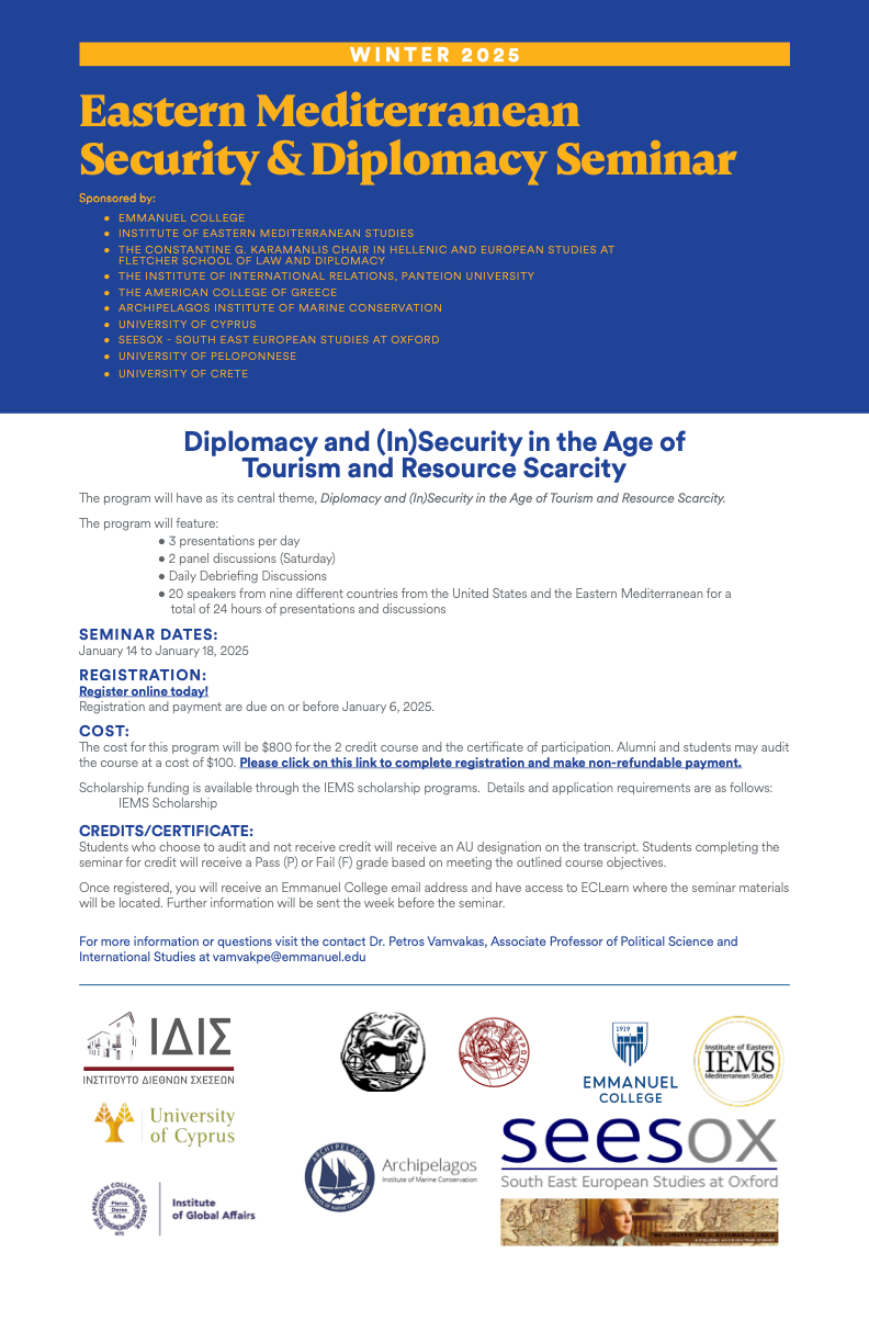 The panel was convened by IEMS founder and Emmanuel Associate Professor of Political Science Dr. Petros Vamvakas. He termed it a great learning opportunity for students to view foreign policy as part of a continuum of issues, many of which are close to home.